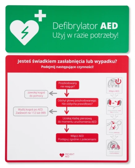 Tablica z algorytmem postępowania przy reanimacji z AED. Wykonana z materiału odpornego na ścieranie i warunki atmosferyczne (spienione PCV). Grubość tablicy: 2 mm. Algorytm podzielony jest na 2 części ułatwiające oznaczenie miejsca instalacji AED. Część zielona o wymiarach 14 x 37 cm, część czerwona: 32 x 37 cm.