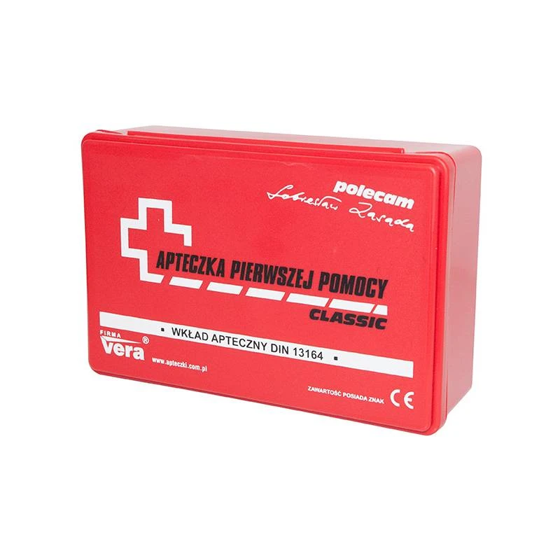 \nApteczka „Classic Din” posiada wymiary 25 x 16 x 8 cm. Apteczka jest bardzo wytrzymała oraz podręczna ze względu na jej prosty kształt jak i materiał. Wykonana została z trwałego tworzywa sztucznego, dzięki czemu chroni jej zawartość przed wpływem czynników zewnętrznych oraz ułatwia przechowywanie zawartości apteczki . Dostępna jest w kolorze czarnym. Podczas jazdy samochodem, powinna być umieszczona w miejscu dostępnym dla wszystkich pasażerów, jednak nie może przeszkadzać w jeździe, a przykładem może być bagażnik, lub tył pojazdu. Apteczka idealnie nadaje się do samochodu, ale także posiada odpowiednie zaopatrzenie, które przyda się w każdym gospodarstwie domowym.
