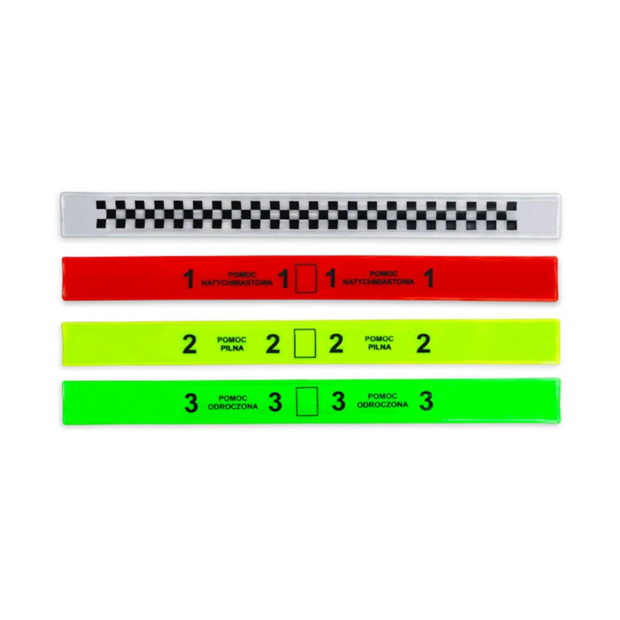 Opaski TRIAGE do uzupełnienia zestawu segregacyjnego TRIAGE. Oferujemy komplet opasek TRIAGE – 4 sztuk w czterech kolorach stosowanych w segregacji osób poszkodowanych tj. czerwonym, żółtym, zielonym oraz szachownicy (czarno-białe). Konstrukcja pasków umożliwia szybkie założenie na kończynę, produkt odporny na niekorzystne warunki pogodowe.