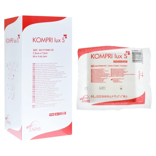 \nKOMPRI lux S - Kompresy z gazy 5cm x 5cm różne warianty wykonany z hydrofilowej gazy bawełnianej, bielonej metodą bez chlorową z użyciem wody utlenionej posiada podwójnie podwijane brzegi tzw. składanie typu „ES” zapobiegające wysnuwaniu się luźnych nitek może być sterylizowany z zastosowaniem pary wodnej, tlenku etylenu lub radiacyjnie \n \nZastosowanie: \n \n