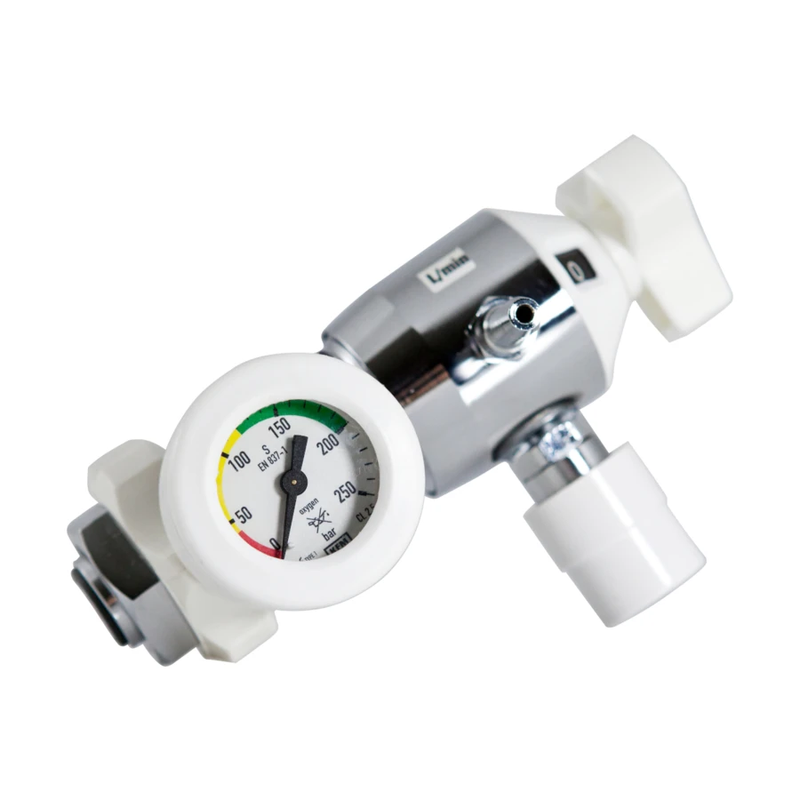 \nReduktor tlenowy z króccem i złączem AGA przeznaczony jest do pracy z butlą z tlenem medycznym. Wykorzystywany jest do zredukowania/zmniejszania ciśnienia pobieranego tlenu z butli, którego wartość można zobaczyć na czytelnym manometrze. Posiada standardowe przyłącze do butli tlenowej DIN G3/4″. Reduktor służy do dystrybucji tlenu ze stałą wielkością przepływu, maksymalnie do 25 l/min. Istnieje możliwość podłączenia go do dozownika tlenu, respiratora lub przewodu sieci tlenowej w karetce.