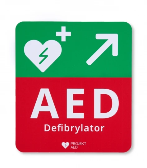 TaTablica kierunkowa AED. Wykonana z materiału odpornego na ścieranie i warunki atmosferyczne (spienione PCV). Grubość tablicy: 2 mm. Duże logo, napis AED i strzałka informują o dostępnym defibrylatorze w danej lokalizacji. Tablica w kolorze zielono-czerwonym o wymiarach: 20 cm x 22,5 cm. Kierunek strzałki: do góry, w lewo