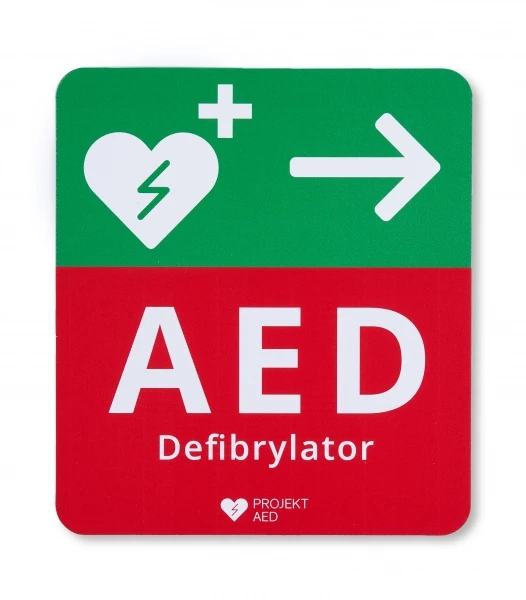 Tablica kierunkowa AED. Wykonana z materiału odpornego na ścieranie i warunki atmosferyczne (spienione PCV). Grubość tablicy: 2 mm. Duże logo, napis AED i strzałka informują o dostępnym defibrylatorze w danej lokalizacji. Tablica w kolorze zielono-czerwonym o wymiarach: 20 cm x 22,5 cm. Kierunek strzałki: w PRAWO
