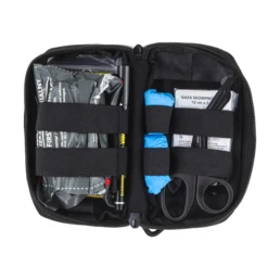 Zestaw STOP KRWOTOK umieszczono w kompaktowej saszetce wykonanej z oryginalnej tkaniny CORDURA® w dwóch wersjach kolorystycznych: czarnej i czerwonej. Zasobnik posiada wysokiej jakości zamek błyskawiczny renomowanej firmy YKK, który gwarantuje niezawodność i długoletnią eksploatację. Z frontalnej strony saszetki na całej powierzchni można znaleźć rzep z otworami wykonanymi technologią „laser cut”, dopasowanymi do systemu MOLLE. Umieszczono na nim dużą, autorską plakietkę gumową z nazwą modułu, informującą o przeznaczeniu produktu. Po przeciwległej stronie saszetki umieszczono dwa, odpinane paski, dzięki którym można ją z łatwością przyczepić choćby do paska czy innego produktu wykorzystującego system MOLLE. U dołu znajduje się zaczep z rozciągliwej gumy dedykowany pod opaskę zaciskową. Wewnątrz saszetki znajdują się wytrzymałe gumy do umieszczenia dedykowanego wyposażenia medycznego.